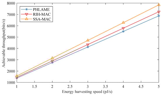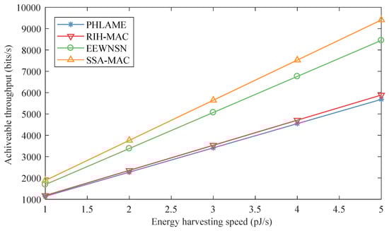 Moreover, the achievable throughput was investigated with different energy harvesting speeds, and the results are shown in Figure 10. In these simulations, the nano-node density was set to 1.5 nano-nodes/. From the above two groups of simulations, we can conclude that the throughput of nano-node is mainly affected by the energy harvesting speed. It also can be verified in Figure 10 that the achievable throughputs of all MAC protocols increase with the energy harvesting speed. The proposed SSA-MAC has the highest throughput. Furthermore, with the increase of energy harvesting speed, the throughput gaps between SSA-MAC and other MAC protocols also increase, e.g., when the energy harvesting speed is 3 pJ/s, the achievable throughput of SSA-MAC is almost 600 bits/s, 2400 bits/s and 2500 bits/s higher than EEWNSN, RIH-MAC and PHLAME protocols, respectively. However, when the energy harvesting speed is 5 pJ/s, the achievable throughput of SSA-MAC is almost 1000 bits/s, 3450 bits/s and 3600 bits/s higher than EEWNSN, RIH-MAC and PHLAME protocols, respectively. This also indicates that the proposed SSA-MAC has better energy efficiency than other MAC protocols.