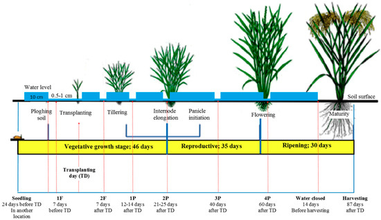 Growth phases of a rice paddy with water, fertilizer and pesticide management. Adapted from [31] under CC BY NC SA3.0 license.