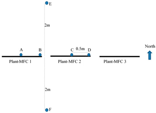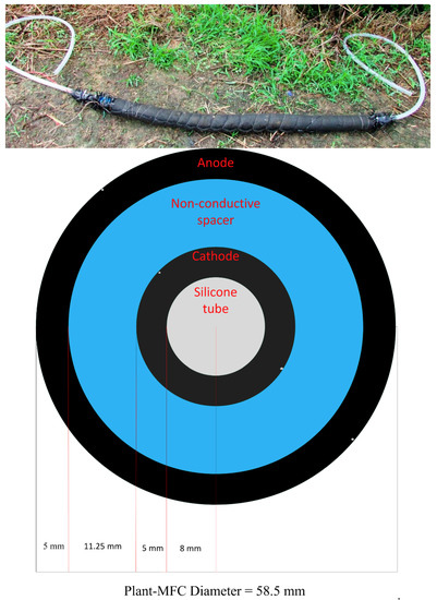 The tubular plant-MFCs were installed manually by hoeing the top soil of the paddy field prior to the transplantation. The tubular plant-MFCs were placed about 10–15 cm below the soil (Figure 3). Both ends of the silicon tubes were bent down with the open hole facing the ground to avoid rainwater from getting into the tube, which would affect the air, i.e., oxygen, supply to the cathode.