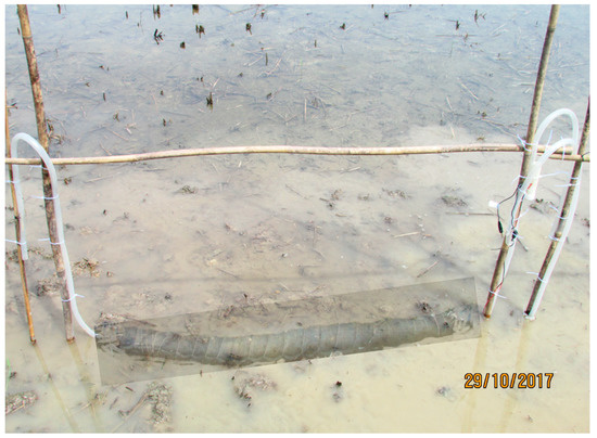 On 28 October 2017, three tubular plant microbial fuel cells (tubular plant-MFCs) were installed in the paddy field (Figure 2). The plant-MFC reactors were installed in lines next to each other from west to east (Supplementary Information Figure S1). The distance between reactors was 30 cm. The tubular plant-MFC was manufactured by Plant-e (Wageningen, The Netherlands) according to a similar design used in [17]. As base a transparent silicon tube (VMQ silicone, 12/16 mm inner/outer diameter; rubbermagazijn.nl, Zoetermeer, The Netherlands) was used to supply oxygen. Consequently the cathode felt, the spacer and finally the anode felt was wrapped around this tube. Both the anode and the cathode were made of carbon felt (KFA-5 mm thickness, SGL Carbon GmbH, Bonn, Germany). The electrode length of each tubular plant-MFC was 1 m and the width for the anode and the cathode was 19 cm and 10 cm, respectively. The spacer was made from non-conductive materials to prevent short circuiting, but is otherwise completely permeable (air filter cloth DA/290, DACT Filter- & Milieutechniek, Kerkrade, The Netherlands). Titanium wire (grade 2, 0.5 mm; Titaniumshop BV, Kampen, The Netherlands) was used as current collector both in the anode and the cathode side. The current collector was tied and wrapped around the cathode and the anode as shown in Figure 2.