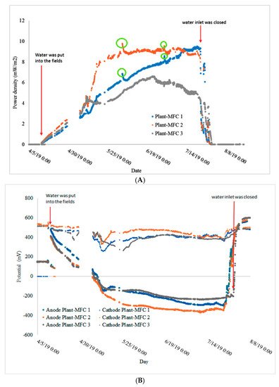 There were several points that the anode potential went down to around 300–100 mV. These phenomena will be discussed further in Section 3.4. When the paddy fields were watered, the anode potentials gradually decreased up to −369 mV while the cathode potential remained stable at around 400 mV (Figure 6B). This means that the cathode overpotential was relatively stable and the anode overpotential decreased. However, when the irrigation was stopped the anode potential increased rapidly and became higher than the cathode potential (Figure 6B and Figure 7). This indicated a rapid increase in the anode overpotential over the cathode overpotential. Based on this, one can conclude that the cathode is not the limiting factor in this Plant-MFC as can be seen from Figure 7. In addition, the weak peaks in the anode and the cathode potential profile in Figure 7 may be related to diurnal (day and night) effect as described in other studies [15]. However we did not specifically study this effect for this article.