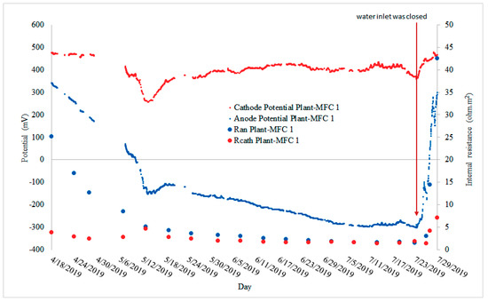 Anode and cathode internal resistance on Plant-MFC 1 during the fourth crop season.