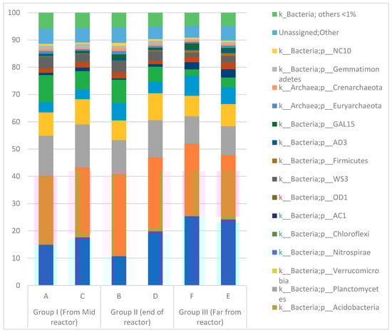 Soil samples were collected (on 30 June 2018) from six different locations for microbial community analysis (Figure 4). Samples were grouped into three: Group I (Samples A and C) was soil that attached on the anode from mid plant-MFC; Group II (samples B and D) was soil that attached on the anode from end of the plant-MFC; and Group III (samples E and F) was from soil with 2 m distance from plant-MFC 1 and 2. After collection, samples were kept in a 30 mL-tube container and keep in a 4 °C fridge. The next day samples were transported for 48 h with a cool-ice box for DNA extraction to Genetika Lab, Jakarta (PT. Genetika Science Indonesia, Jakarta, Indonesia), a partner company of 1st BASE Axil Scientific Pte Ltd., Singapore.