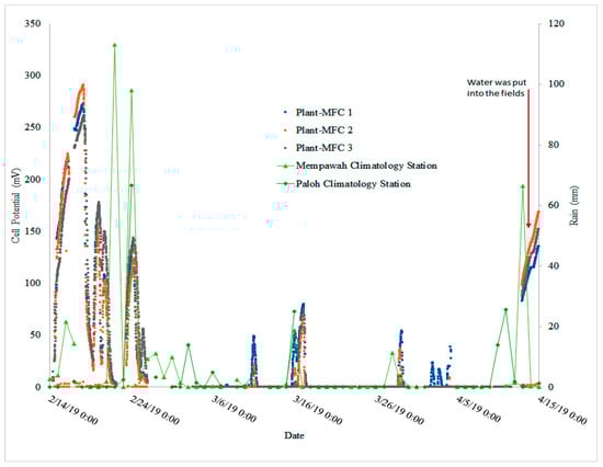 Plotting the rain data (Supplementary Information Table S2) and the cell potential peak on the same graph as shown in Figure 9, one can see that there is some correlation between the rain and the cell potential peaks. This result suggests that there is a possibility to utilize Plant-MFC as a bio-indicator (such as of a rain event or as a wetland drying indicator). In Figure 9, there are some rain events (around 27 February 2019 to 6 March 2019) that occurred without being accompanied by cell potential peaks. In addition, there are some peaks occurring (around 30 March 2019 to 5 April 2019) when there was no rain. In both cases, they happened on low rainfall (<20 mm). The first case indicates that the rain state did not reach the research site. Moreover, the second case might indicate there is local rain in the research site. It should be noted that there is a mountain close by the research site. Bawang mountain (Bawang means onion in Indonesia Language) is situated about 8 km to the west side of the research site. Bawang mountain stretches for 15 km from (0.856579, 109.465752) to (0.960704, 109.360416). The local climate of the research site is also influenced by the presence of this mountain, for instance via orographic rainfall [42]. Therefore, actual rain data from the Plant-MFC installation location are needed to further clarify this correlation. In this study, although it is known that temperature does affect current generation in the lab, temperature is not likely to influence the plant-MFC performances since the temperature in the research site was rather constant during the day and night [43] (Supplementary Information Figure S6).