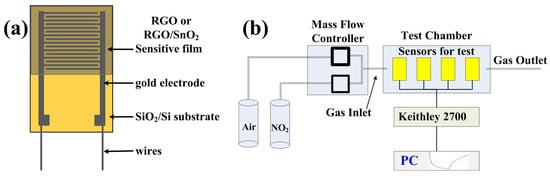 RGO aqueous dispersion (0.43 wt%, RGO: 96.41% C, 3.59% O, 1–10 layers) was purchased from Chengdu Organic Chemicals Co. Ltd., Chinese Academy of Sciences (Chengdu, China). SnO nanopowder (purity 99.5%) was purchased from Chengdu Kelong Chemical Reagent Factory (Chengdu, China). In a typical synthesis, 2 mL RGO aqueous dispersion (0.43 wt%) was diluted to 1/20 by using 38 mL deionized water, and then sonicated for 20 min to obtain a uniform dispersion (0.0215 wt%). After that, the different amounts (0, 20, 40 and 80 mg) of SnO nanopowders were added into 10 mL diluted RGO dispersion (0.0215 wt%) and ultrasonicated for 20 min to obtain the composite solutions that the weight percentages of RGO were 100%, 9.7%, 5.1% and 2.6%. 0.5 mL of RGO, 9.7%RGO/SnO, 5.1%RGO/SnO and 2.6%RGO/SnO aqueous dispersions were respectively airbrushed onto interdigital electrodes (IDEs), and finally dried in a vacuum oven at 70 C for an hour to fabricate NO sensors. Figure 1a depicts a schematic of the as-fabricated gas sensors. The IDE has a size of , and 20-nm-thick titanium is thermally evaporated on SiO(300 nm)/Si, and then 100-nm-thick gold is evaporated thereon. The finger width and gap width of the IDE are both 0.05 mm.