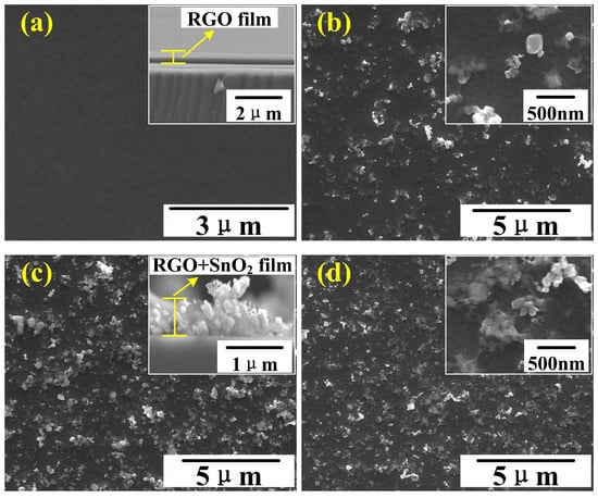 (a–d) SEM images of RGO, 9.7%RGO/SnO, 5.1%RGO/SnO and 2.6%RGO/SnO film. The inset figures in (a,c) are cross-section images. The inset figures in (b,d) are magnification images.