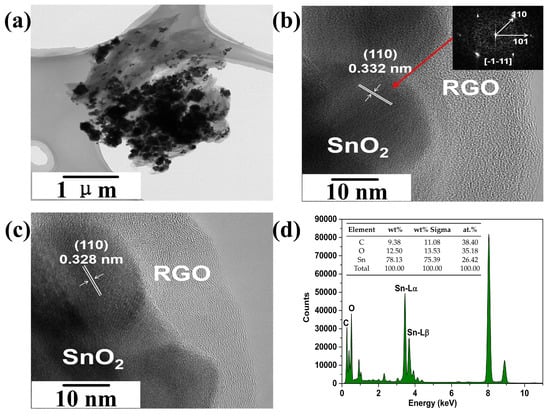 (a) TEM image, (b,c) HRTEM images and (d) EDX spectra of 5.1%RGO/SnO nanocomposites. Inset in (b) presents the corresponding processed reduced FFT pattern of the HRTEM image.