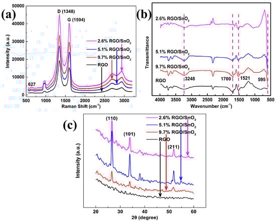 Raman spectra are commonly used to characterize graphene-based materials. The Raman spectra of the RGO film and the RGO/SnO composite films in Figure 4a show two main peaks at 1348 cm and 1594 cm, which correspond to the D and G bands of RGO respectively. The D band is related to the structural defects and partially-disordered structures in the material, while the G band assigns to the graphitic hexagon-pinch mode [,,]. The weak peaks located at around 627 cm are attributed to SnO[]. Both characteristic peaks of RGO and SnO can be seen in the Raman spectra of the composite films, further evidence for the formation of RGO/SnO nanocomposites.