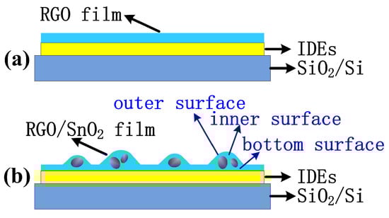 In recent years, graphene and its derivatives (such as graphene oxide (GO) and reduced graphene oxide (RGO) etc.) have shown great potential in chemical- and bio-sensors because of their low cost, high specific surface area, low electrical noise and high carrier mobility at room temperature [,]. To further improve the performances of SnO gas sensors, graphene and RGO are usually composited with SnO nanoparticles, and its superiority has been demonstrated by some studies [,,,,,].