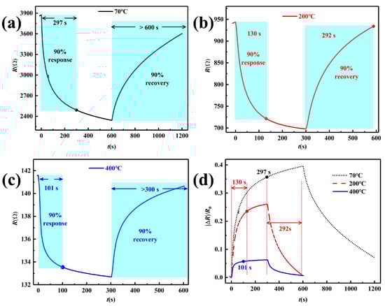 Response and recovery curves of sensors toward 50 ppm NO. (a–c) Real-time resistance curves of sensors annealed at 70, 200, 400 C, (d) real-time response curves.