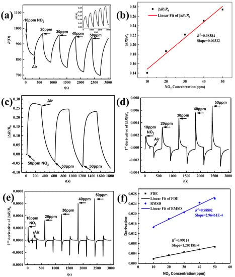 Figure 8a displays the real-time resistance change of 5.1%RGO/SnO sensor annealed at 200 C upon exposure to 10–50 ppm NO, and the response curve is given in the inset. The resistance decreases quickly and reach a saturated state slowly as NO is injected, and then increases to the baseline as NO is purged by air. The sensor response increases with increasing NO concentration. The linear relationship between the response and gas concentration is significant (), which can be seen from Figure 8b. To evaluate repeatability, the response curve of the sensor toward 50 ppm NO during three cycles is given in Figure 8c, from which the response and recovery can basically maintain stability. This indicates that the as-fabricated sensor can detect NO at room temperature with a small baseline drift. Along with our previous work [], the First Derivative Extrema (FDE) and the square Root of Maxima of Second Derivative (RMSD) are both proportional to the gas concentration and not affected by the baseline drift, so the velocity and acceleration of the response is calculated, the corresponding curves are demonstrated in Figure 8d,e. The extrema of the 1st and 2nd derivative increase with the enhancement of NO concentration, and they can be used to calibrate gas concentrations. The FDE and RMSD are extracted, and their linear fitting in Figure 8f exhibits better linearity with R 0.99114 and 0.98802, respectively.
