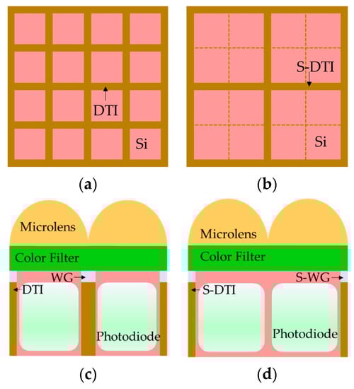 Pixel structures with deep trench isolation (DTI) and tungsten grid (WG): (a) Top view of the silicon with DTI. The DTI has located each pixel; (b) Top view of the silicon with spatial deep-trench isolation (S-DTI). The S-DTI has located four pixels; (c) 2D cross-section of pixels with DTI and WG; (d) 2D cross-section of pixels with S-DTI and S-WG.