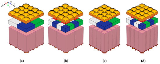The simulated 3D Pixel structures. 4 × 4 pixel arrays. The microlens, CFA, and photodiodes are separated for ease of viewing. (a) Quad-Bayer CFA with DTI and WG, (b) Quad-Bayer CFA with S-DTI and S-WG, (c) Quad-WRGB CFA with DTI and WG, and (d) Quad-WRGB CFA with S-DTI and S-WG.