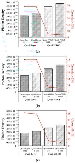 Figure 4 shows the photon density and the crosstalk for the simulation results of the four types of pixels having the quad-Bayer CFA, quad-WRGB CFA with DTI and WG, or S-DTI and S-WG for the 1.0, 0.9, and 0.8 μm pixel pitches. The photon density represents the light absorbed from the pixels, as shown by the bars. The photon density is the result of adding the results for the wavelength of 650, 540, and 450 nm. These results show that the photon density is improved in all cases by changing the CFA from the quad-Bayer to the quad-WRGB. For all pixel pitches, about 43% of the photon density is enhanced between the quad-Bayer CFA and quad-WRGB CFA with DTI and WG by the white color filter. S-DTI and S-WG also affect the enhancement of photon density, as the enhancement increases as the pixel pitches decrease in size. The maximum improvement of the photon density by S-DTI and S-WG was 16.8% in the quad-WRGB CFA for the 0.8 μm pixel. The minimum improvement of the photon density was 9.7% in the quad-Bayer CFA for the 1.0 μm pixel. The changes in photon density with improved sensitivity of the pixel were a maximum of 58.2%, 67.0%, and 66.3% for the 1.0, 0.9, and 0.8 μm pixels with the quad-WRGB CFA, S-DTI, and S-WG. The crosstalk, which is absorbed light from the next pixel, is represented by the lines in Figure 4. The crosstalk is the rate between the unwanted photon density and the total photon density. As shown in Figure 4, the crosstalk is reduced by S-DTI and S-WG for all types of pixels. The crosstalk was reduced by S-DTI and S-WG at 0.02%, 0.08%, and 0.37% for the 1.0, 0.9, and 0.8 μm pixels, respectively, with the quad-Bayer CFA. The crosstalk was also reduced by S-DTI and S-WG by 0.21%, 0.22%, and 0.45% for the 1.0, 0.9, and 0.8 μm pixels, respectively, with the quad-WRGB CFA. In this work, the crosstalk in the same color filter can be used a good crosstalk as the absorbed photon density. Therefore, we see that the good crosstalk can be absorbed as a signal. This concept is based on the pixel binning which is a process to combine the readout signals of the four same color pixels at a time in the quad-Bayer CFA [13,14]. Therefore, the crosstalk is reduced and the sensitivity is improved. For this pixel binning, the S-DTI/S-WG is useful by passing the crosstalk to the next same color pixel. In addition, the reason that the quad-WRGB CFA has the lower crosstalk than the quad-Bayer CFA is the white pixel which is regarded as having no crosstalk. This is because the full wavelength of the incident light can be absorbed in the white color pixel.
