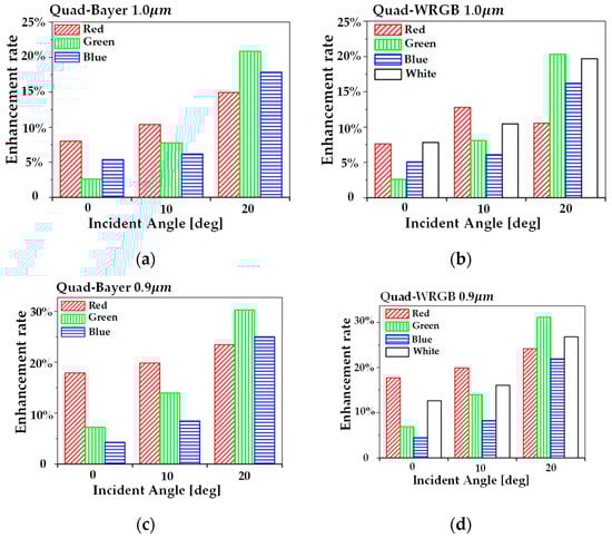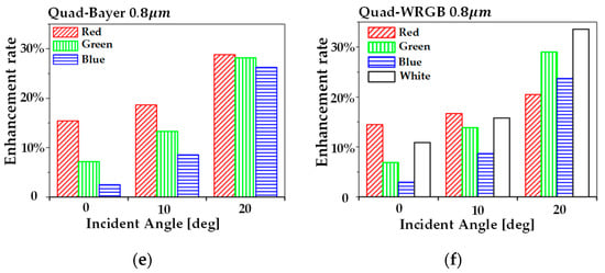 A comparison of the sensitivity improvement by the incident angle and pixels is shown by the enhancement rate of the photon density depicted in Figure 5. The enhancement rate is obtained from the ratio of the photon density between the pixel with DTI/WG and the pixel with S-DTI/S-WG. The red oblique striped bar, the green vertical striped bar, the blue horizontal striped bar, and the blank bar indicate the enhancement rates in the red, green, blue and white pixels, respectively. Figure 5a,c,e show the results for pixels having the quad-Bayer CFA, and Figure 5b,d,f show the results for pixels with the quad-WRGB CFA. Figure 5a–f indicate the 1.0, 0.9, and 0.8 μm pixel pitches, respectively. The photon density as the sensitivity of the pixel is enhanced to a maximum of 20.8% for the quad-Bayer CFA and 20.3% for the quad-WRGB CFA in 1.0 μm pixel. The best enhancement rates for the 0.9 μm pixel are 30.3% of quad-Bayer CFA and 31.2% of quad-WRGB CFA. The best enhancement rates for 0.8 μm pixel are 28.8% of quad-Bayer CFA and 33.6% of quad-WRGB CFA. These results, shown in Figure 5, confirm that every photon density is improved by S-DTI and S-WG for every incident angle. The photon density is enhanced more in the oblique incident light. This is because crosstalk, which gets worse in oblique incident light, is used efficiently as the photon density in the same color pixel.