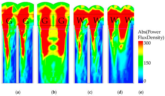 The beam profiles of the simulated power flux density. The incident light was a 540 nm wavelength at 20°: (a) the green pixels of the quad-Bayer CFA with DTI/WG in a 0.9 μm pixel, (b) the green pixels of the quad-Bayer CFA with S-DTI/S-WG in a 0.9 μm pixel, (c) the white pixels of the quad-WRGB CFA with DTI/WG in a 0.8 μm pixel, (d) the white pixels of the quad-WRGB CFA with S-DTI/S-WG in a 0.8 μm pixel, (e) the scale bar of power flux density. The red region in the beam profile shows the most transmitted light, which could be absorbed in the photodiode.