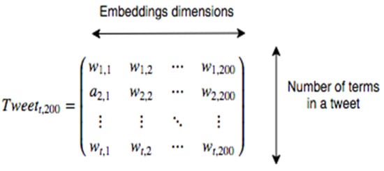 - Embeddings-based: Words, emojis, suffixes, and tokens embeddings are obtained using word2vec. These embeddings can be extended by attaching them POS tags (transformed using one-hot encoding) and Text Frequency-Inverse Document Frequency (tf-idf) Kusner et al. [] information. Tf-idf represents the importance of a term in a document relative to the whole corpus. It is based on the idea that a term that appears many times inside a document must be relevant for that document, but if it appears many times in other documents, its relevance decreases.