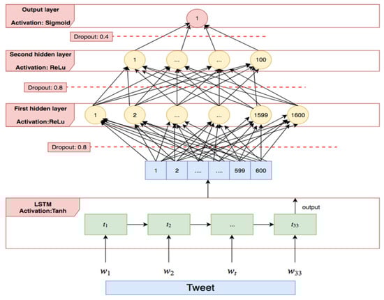 As further detailed next, the contributions related to hate speech classification research are mainly twofold. (1) A new public dataset that can be used to test, train, and benchmark new developed methods. This contribution is very relevant as authors have so far only found three public hate-speech datasets [,,]. The first two datasets have the inconvenience of consisting of ids of tweets to download. As Twitter periodically erases some tweets, especially if offensive, it is currently not possible to download the original datasets presented in [,]. Besides, most of the related literature on hate speech is benchmarked against them [,,,]. Therefore, it is crucial for future advances in this domain to provide new self-contained public datasets. (2) A new classification approach, referred as a double deep learning neural approach, consisting of a combination of a Long Short-Term Memory (LTSM) and a Multilayer Perceptron (MLP) neural network that takes as input words, emojis, and expression tokens’ embeddings of a tweet, enriched by the tf-idf. The embeddings are, in turn, obtained using a neural network-based word2vec methodology. Our experiments have shown that this approach outperforms reference models in the literature.