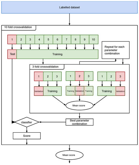 - Random Forests (RF): Ensemble classifiers whose construction is based on the use of several decision trees []. Each decision tree is trained with a sample bootstrapped from the training dataset and using a random subset of the features. Decision trees partition the factor space according to value tests, therefore resulting in a nonlinear classification. The nodes of the trees are determined so as to maximize the information gain. There are different criteria for determining this information gain being Gini and entropy two of the most common.