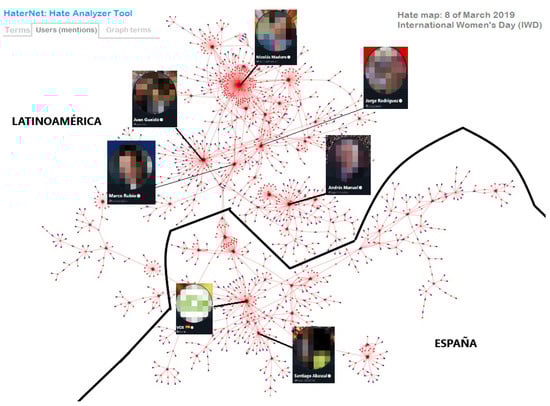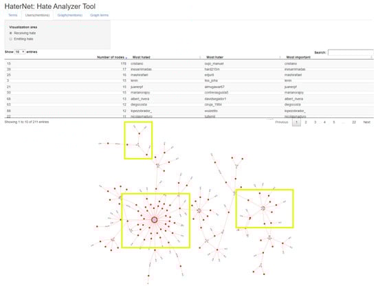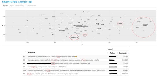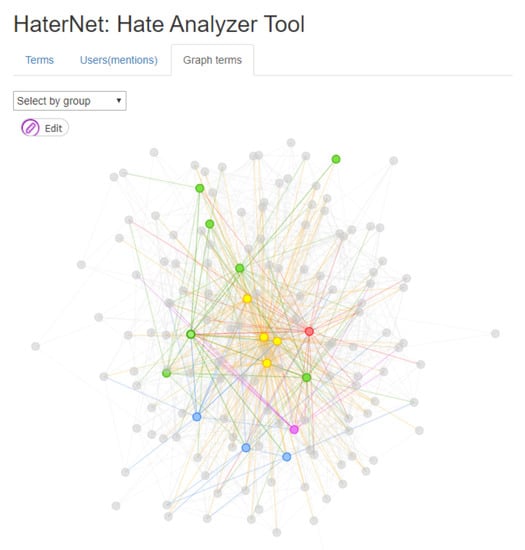 It is in the second module, the “Social Network Analyzer”, where the main novelty of this paper lies. In fact, the literature on hate speech so far has been concerned only on studying and proposing methods that classify texts as containers of hate speech or not. We go one step further: the classification provided by HaterNet can be used to build networks of concepts and actors, according to their relationship to the hate messages, which can then be visually represented. To the best of the authors’ knowledge, this is the first system with these characteristics that has been presented in the literature []. There are many services and application contexts that can benefit from it. For instance, it provides an interpretable graphical representation of the classification algorithm functioning. Whereas other systems are usually black-boxes, HaterNet illustrates the relevant terms, receivers, and emitters identified inside hate speech texts. This feature could be used for either further studying correlations or different aspects inside hate containing text, or for detecting biases. Transparency and explainability are currently hot topics in the area of artificial intelligence tools [], as well as bias in classification algorithms []. Another usage of this function is related to policing and journalism. In fact, observers can use HaterNet to analyze the evolution of different hate trends, key words, or actors; study their triggers; and design protocols to mitigate concrete peaks of hate; among others.