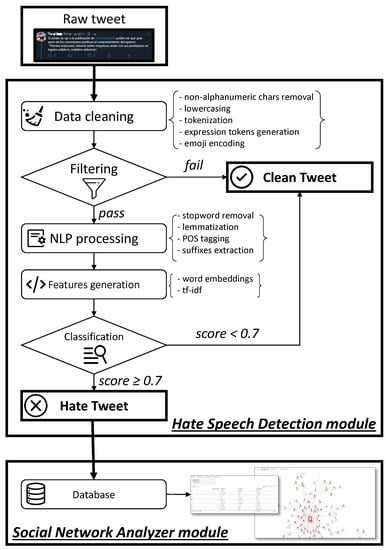 - The use of non-SM predictor variables is mainly limited to past values of objective phenomenons (weather and budgets) and demographics [,]. In contrast, HaterNet uses prediction features (e.g., the appearance of suffixes) extracted from the text by applying NLP techniques.