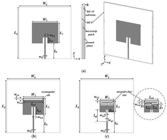 Recently, a meander-line slot (MLS) has been applied to microstrip patch antennas for miniaturization and multi-band operation. The resonant frequencies, bandwidth, and gain characteristics of a microstrip patch antenna were compared when single and dual MLSs were loaded in various locations in the patch [35]. A miniaturized tri-band microstrip patch antenna loaded with an MLS in the middle of the patch and a double circular ring resonator in the ground was proposed for operating at 3.2 GHz, 5.4 GHz, and 5.8 GHz [36]. However, an attempt to improve the relative permittivity sensitivity by using the MLS for the microstrip patch antenna has not been tried.