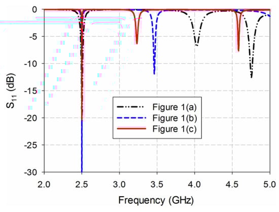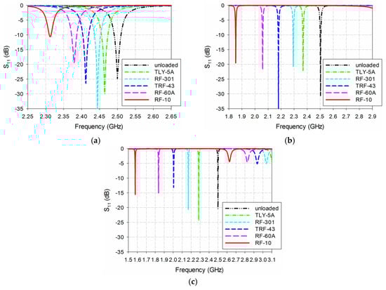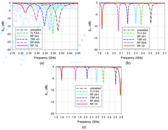 Simulated S11 characteristics of the three MPSAs for MUTs in Table 2: (a) conventional MPSA; (b) RS-loaded MPSA; and (c) proposed MLS-loaded MPSA.