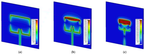 Figure 3 shows the electric field distributions of the conventional, the RS-loaded, and the proposed MLS-loaded MPSAs at the first resonant frequency of 2.5 GHz. We can see that the electric fields are widespread along the two radiating edges of the patch for the conventional MPSA. When RS is loaded along one of the radiating edges, the electric fields are concentrated along the RS, as shown in Figure 3b. For the proposed MLS-loaded MPSA, the electric fields were more concentrated near the MLS with the reduced area. Therefore, the size of the MUT can be extensively reduced, compared to the conventional MPSA.