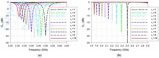 Figure 4 shows the S11 characteristics of the conventional, the RS-loaded, and the proposed MLS-loaded MPSAs when the MUT was placed above the patch as a superstrate. The MUT’s relative permittivity (εr) was varied from 1 to 10 in increments of 1 with a zero loss-tangent, as in the lossless case. The width and length of the MUT are the same as those of the ground plane, and its thickness was chosen to be 1.6 mm because the thickest of the substrates available from Taconic Inc., which were used as the MUTs, was around 1.6 mm. For the conventional MPSA, the first resonant frequency of S11 moves from 2.5 GHz to 2.312 GHz when εr increases from 1 to 10, whereas it shifts from 2.5 GHz to 1.854 GHz for the RS-loaded MPSA. The first resonant frequency of the proposed MLS-loaded MPSA moves from 2.5 GHz to 1.585 GHz when εr increases from 1 to 10. Table 1 summarizes the first resonant frequencies of the S11 responses with a different relative permittivity of the MUT for the three MPSAs.