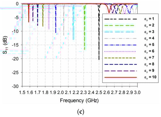 S11 characteristics for varying relative permittivity of the material under test (MUT): (a) conventional MPSA; (b) RS-loaded MPSA; and (c) proposed MLS-loaded MPSA.