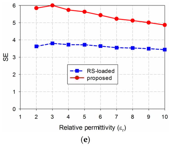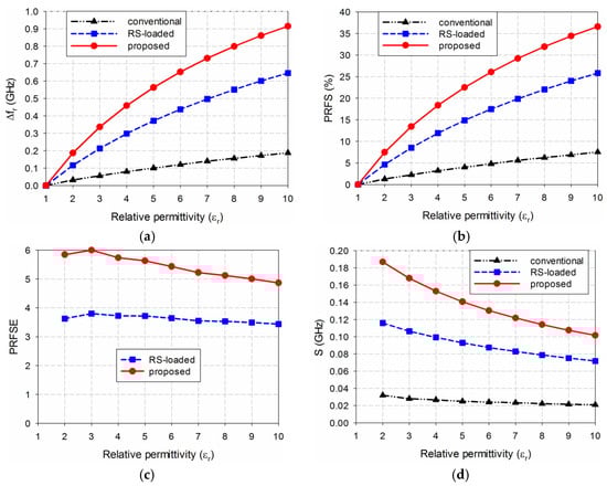 We observe from Figure 5d that sensitivity S is not constant as a function of relative permittivity. For example, when the permittivity of the MUT is εr = 2, frequency shift Δfr in the first resonant frequency of the conventional MPSA is 0.032 GHz, whereas for the RS-loaded and the proposed MLS-loaded MPSAs it is 0.116 GHz and 0.187 GHz, respectively. PRFS in the first resonant frequency of the conventional MPSA is 1.28%, whereas for the RS-loaded and the proposed MLS-loaded MPSAs it is 4.64% and 7.48%, respectively. Therefore, PRFSE for the RS-loaded and the proposed MLS-loaded MPSAs, compared to the conventional MPSA, are 3.63 and 5.84. In this case, S is the same as Δfr because the difference in the relative permittivity (Δεr) is 1. SE values of the first resonant frequency of the RS-loaded and the proposed MLS-loaded MPSAs, compared to the conventional MPSA, are 3.63 and 5.84. It is worthwhile to note that PRFSE is the same as SE, and it can be used to estimate the sensitivity enhancement when the resonant frequencies of the MPSAs are different, because the sensitivity enhancement cannot be used for different resonant frequencies.