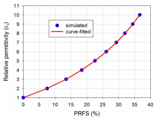 The PRFS of the simulated first resonant frequency for the proposed MPSA when the MUT’s relative permittivity (εr) was varied from 1 to 10 in increments of 1 was used to derive Equation (7). Figure 6 compares the simulated and curve-fitted relative permittivity of the MUT as a function of PRFS. Errors between the simulated and curve-fitted relative permittivity at the input data points were kept to less than 0.1%.
