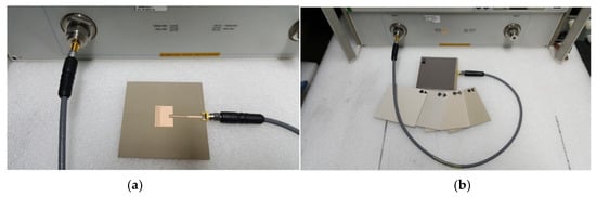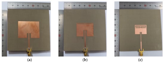 Prototypes of the three MPSAs were fabricated on an RF-35 substrate (εr = 3.5, tan δ = 0.0018, h = 0.76 mm), as shown in Figure 7. The S11 characteristics of the fabricated antenna were measured using an Agilent N5230A network analyzer, and photographs of the experiment setup are shown in Figure 8. Five different standard dielectric MUTs from Taconic, Inc., were tested for the sensitivity comparison. The MUTs had relative permittivity ranging from 2.17 to 10.2, and their relative permittivity, loss tangent, and thickness from the data sheet in [39] are summarized in Table 2.