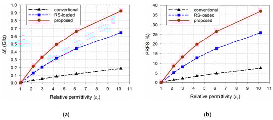 When the permittivity of the MUT is increased to εr = 3, Δfr in the first resonant frequency of the conventional MPSA is 0.056 GHz, whereas those for the RS-loaded and the proposed MLS-loaded MPSAs are 0.213 GHz and 0.336 GHz, respectively. PRFS in the first resonant frequency of the conventional MPSA is 2.24%, whereas for the RS- and the proposed MLS-loaded MPSAs, they are 8.52% and 13.44%, respectively. Therefore, PRFSE values for the RS-loaded and the proposed MLS-loaded MPSAs, compared to the conventional MPSA, are 3.80 and 6.00. S values for the first resonant frequency of the conventional, the RS-loaded, and the proposed MLS-loaded MPSAs are 0.028 GHz, 0.107 GHz, and 0.168 GHz, respectively. SE values of the first resonant frequency of the RS-loaded and the proposed MLS-loaded MPSAs compared to the conventional MPSA, are 3.80 and 6.00.