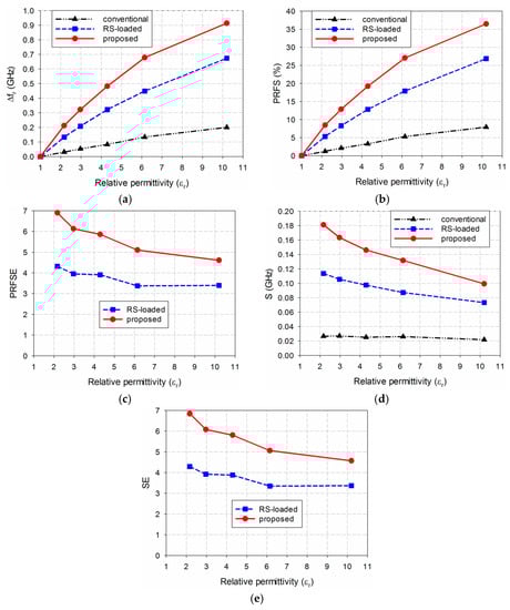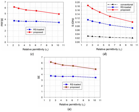 Based on the results shown in Figure 4 and Table 1, the sensitivity performance of the three MPSAs was analyzed using Equations (2)–(6). First, Δfr of S11 for the three MPSAs is plotted in Figure 5a. Figure 5b shows the PRFS of the three MPSAs. The PRFSE for the RS-loaded and the proposed MLS-loaded MPSAs, compared to the conventional MPSA, is presented in Figure 5c. Next, S of the first resonant frequencies for the three MPSAs is plotted in Figure 5d. Figure 5e presents the SE of the RS-loaded and the proposed MLS-loaded MPSAs, compared to the conventional MPSA.