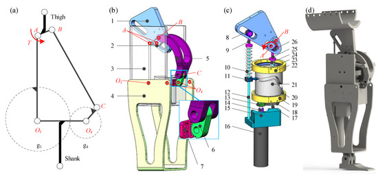 (a) Schematic diagram, (b) structure, (c) actuation mechanism, and (d) CAD model of the GFB prosthetic knee. 1-level arm (fixed on linkage ), 2-linkage (thigh linkage), 3-linkage (frame), 4-linkage (shank linkage), 5-linkage , 6-linkage (incomplete gear centered at hinge ), 7-incomplete gear (fixed on linkage ), 8-bearing, 9-spring fastening, 10-helical spring, 11-cam roller, 12-guide, 13-transmission gear, 14-coupling, 15-motor cabinet (fixed on frame), 16-motor, 17-guide, 18-transmission gear, 19-bearing chock, 20-bearing, 21-cylindrical conjugate cams (two cam grooves on outer/inner walls of the cylinder), 22-bearing chock, 23-bearing, 24-helical spring, 25-spring fastening, 26-bearing.