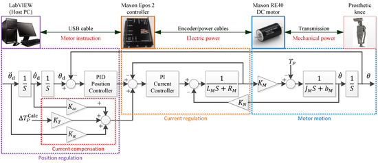 Motor control system (feedforward current compensations are provided to deal with inertial-related, speed-related and load-related changes in the prosthetic system). and are the inductor and the resistor of the motor, and and are the moment of inertial and damping of the motor and transmissions; and are the torque constant and the speed constant of the motor, respectively; , and are corresponding gains of feedforward current compensations; is the needed actuating torque of the prosthetic knee, and is the calculated prosthetic torque changes by real-time inverse dynamics of the prosthetic knee.