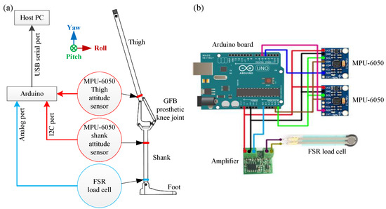 The attitude measurement of the GFB prosthetic knee is to use mechanical sensors to obtain the locomotion data for the neural network control. The specific platform is shown in Figure 3, which consists of an Arduino Uno board, dual IMU sensors (MPU-6050, InvenSense, San Jose, CA, USA) and one FSR load cell (Force Sensing Resistor, Interlink Electronics, Camarillo, CA, USA). The Arduino UNO development board works as a sensor hub to communicate with the host computer. The FSR load cell is installed at the bottom of the prosthetic knee to distinguish the stance phase and the swing phase in the level-ground walking cycle. Dual MPU-6050 sensors, which are individually accessed via the I2C address 0x68 (the one whose AD0 port is set high) and 0x69 (the one whose AD0 port is configured low), are installed on the upper and lower linkages of the GFB prosthetic knee to measure the motions of the lower extremity. The Yaw, Pitch, and Roll data of the thigh and the shank can be directly obtained by the DMP (Digital Motion Processor) within two MPU-6050 sensors, the sampling frequency of which are set as 100 Hz.