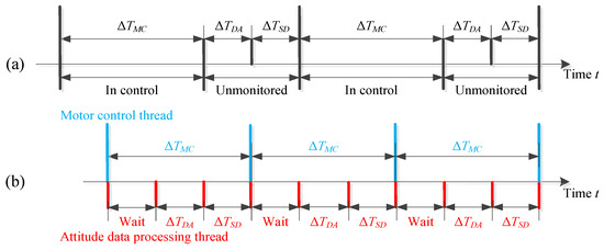 (a) Serial and (b) parallel implementation of the attitude data acquisition, processing, and motor control. represents the period the motor control command is sent and executed; represents the period to collect the transmitted attitude data from Arduino; is the period required for the host PC to process the transmitted data.