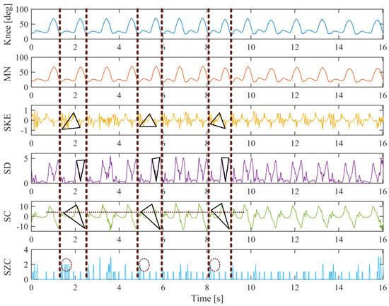 Figure 7 shows the feature extraction of the “acceleration->fast walking->deceleration” walking of the subject 1 by using the five criteria discussed above. The knee gait input consists of 14 cycles that last about 16 s. It can be directly noticed from the knee angle curve that the duration of one cycle at different walking speeds differs. The duration of one cycle in the fast walking is shorter than that in the slow walking, i.e., this information can be used for the identification of different walking speeds. However, the acceleration or deceleration phase cannot be easily identified by the original knee angle curve, which must be implemented with the help of other feature curves. For instance, the acceleration or constant speed or deceleration can be efficiently recognized via the SKE curve. In the acceleration stage, the slope of the triangle formed by the start lowest point, the middle highest point and the end lowest point is much higher than that in the constant speed walking, while it is much lower in the deceleration stage. These same characteristics can also be revealed from the SD, SC and the SZC curves. Therefore, by using these curves for gait stage and transition identification, the actual walking status of the patients can be obtained to realize the adaptive control of the GFB prosthetic knee.