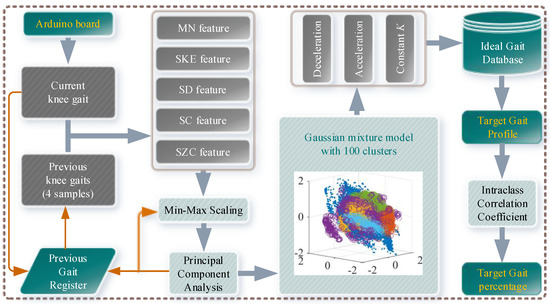 The workflow of the Gaussian mixture model-based gait classifier (GMMGC) is as follows: the GMMGC first obtains the current knee angle and the last four samples of previous knee angles from the Arduino board and the Previous Gait Register (PGR), respectively. Then the Mean (MN), the Skewness (SKE), the Slope Count (SC), and the Slope Zero Crossing (SZC) features of the total five input samples are extracted. Because the amplitude of different feature differs (for example, the MN feature is an order of magnitude larger than others), each feature is normalized via the Min-Max Scaling method by extracting their previous four samples from the PGR to ensure that each feature will have the same impact on the final classification result. In order to improve the efficiency of the gait classification, this paper used the Principal Component Analysis (PCA) to perform the dimension reduction of input knee gait features. To ensure all the variability of the dimensionally reduced features is larger than 90%, the first three components are adopted for the subsequent gait classification.