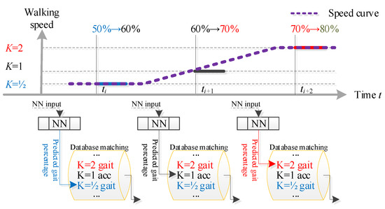 For example, in a theoretical control state as shown in Figure 10, speed ratios and gait percentages calculated by Equation (1) are at , at , and at , respectively. At , the neural network predicted gait percentage is 60%. Then the next prosthetic knee attitude is obtained by matching 60% gait percentage with the ideal gait data; at the next prosthetic knee attitude is generated by matching the neural network predicted 70% gait percentage with the acceleration ideal gait; and so on.
