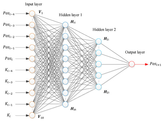 The input layer of the BP neural network has 10 nodes that correspond to 10 input variables, namely, last four and current gait percentages and the speed ratios of the prosthetic knee (5 points in 100 ms are used as the input variable of the neural network because a 100 ms time window contains enough data information for pattern recognition, and the amount of data processed is not particularly large. Using 7, 9, or more points as the inputs will not improve the detection accuracy). Since the control system cannot be expressed in the form of a continuous function, the BP neural network is set as the double hidden layer 8 × 5 (Compared with 10 × 5 and 8 × 3 structures and other configurations, the 8 × 5 hidden layer structure has the best correlation between the predicted value and the expected value after testing). The activation function of the neural network is the S-type function, and the output layer is a single node (the predicted value).