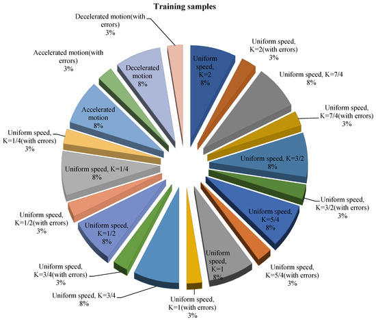 To ensure that the neural network has excellent generalization performance and a high recognition rate, 3500 training samples of ten different categories are used in this paper. The training data in each category contains 87.5% correct data and 12.5% error data (inputs are modified with slight noise and accidental errors), as shown in Figure 12. Specific training data is collected via recorded gait from Section 3.1. The reference speed (i.e., ) is 1.3 m/s.