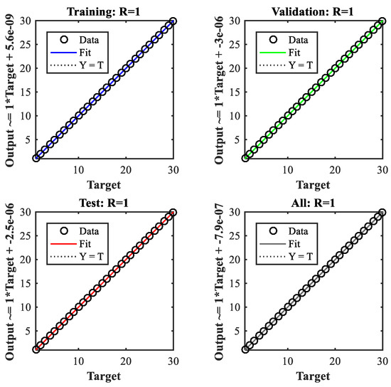 By using 500 separate sets of validation data and another 500 different sets of test data, the regression of training, validation, and test are shown in Figure 13. The overall performance of the trained neural network reaches 1.19 × 10−10, which proves that the designed neural network has the right prediction and correction over the training data.