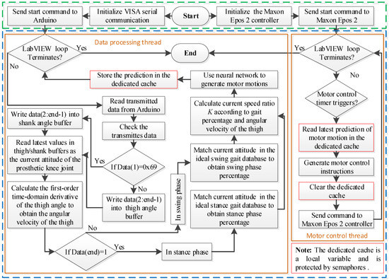 The overall control flowchart of the GFB prosthetic knee is shown in Figure 14. The attitude data acquisition/processing thread and the motor control thread are run in parallel, while their thread data is synchronized by local variables.