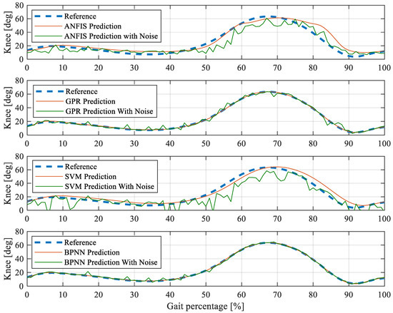 The BP neural network, the ANFIS, the GPR, and the SVM are all trained with the same training dataset. To evaluate the prediction ability of these methods, a test reference gait and its noised one are utilized to check the prediction accuracy. The results are depicted in Figure 15. It can be known from Figure 15 that the prediction accuracies of ANFIS for both the reference gait and the noised one are not satisfactory. The root means square errors (RMSEs) of the ANFIS predicted gaits to the reference gait and the noised reference gait are 5.4179 deg and 6.9074 deg, respectively. The prediction of SVM for the reference gait is close to expected, but the prediction of the noised one is poor. The RMSEs of the SVM predicted gaits to the reference gait and the noised reference gait are 2.9665 deg and 12.3637 deg, respectively. This result indicates that the SVM method is susceptible to noise, which limits its practical effects if no additional robust algorithms are provided.