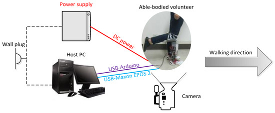 To experimentally verify the neural network control, an able-bodied subject (height: 178 cm, weight: 63 kg, age: 22, the written consent form was obtained prior to experiments) participated in the test of the GFB prosthetic knee via a particular connecting apparatus by flexing his knee to 90°, as shown in Figure 17. The GFB prosthetic knee is directly supplied with power through a dedicated DC power supply (DP712, Rigol, China). Experimental ankle trajectories and knee angles are collected by the camera (G920, Logitech, Switzerland) via video post-processing.