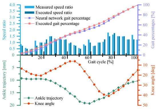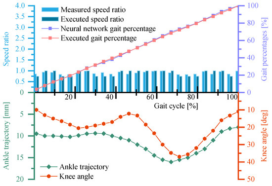 It can be obtained from Figure 20 that the executed speed ratio of the GFB prosthetic knee fluctuates between and in the whole gait cycle and two peak speed ratios occur in the middle of both the stance phase and the swing phase. This indicates that the volunteer accelerated the prosthetic knee in the early stance/swing phase and then tried to decelerate the prosthetic knee in the late stance/swing phase. Because the pre-trained neural network can deal with accelerated/decelerated walking gait, the executed speed ratio generated by the neural network can follow the variable-speed walking well. The small deviation between the neural network predicted gait percentage and the executed gait percentage of the prosthetic knee is caused by the insufficient actuating torque of the cam-based nonlinear series elastic actuator when the speed ratio exceeds . Compared with Figure 19, the amplitudes of the ankle trajectory and the knee angle curve of the volunteer are slightly larger, which is in line with the gait of variable speed walking.