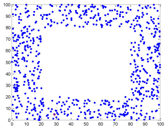 Consider a wireless network consisting of nodes, where there are anchors and agents. We denote the position of the node as , where stands for the set of the indexes of agents, while is the set of the indexes of anchors. These sensors are assumed to be uniformly distributed in an area. All anchor and sensor nodes are assumed to have the same range (i.e., transmission capability), denoted by . Each node is then able to directly communicate with any other node located in the disc having that node as a center and as a radius, while it communicates in a multi-hop fashion with the nodes located outside it.